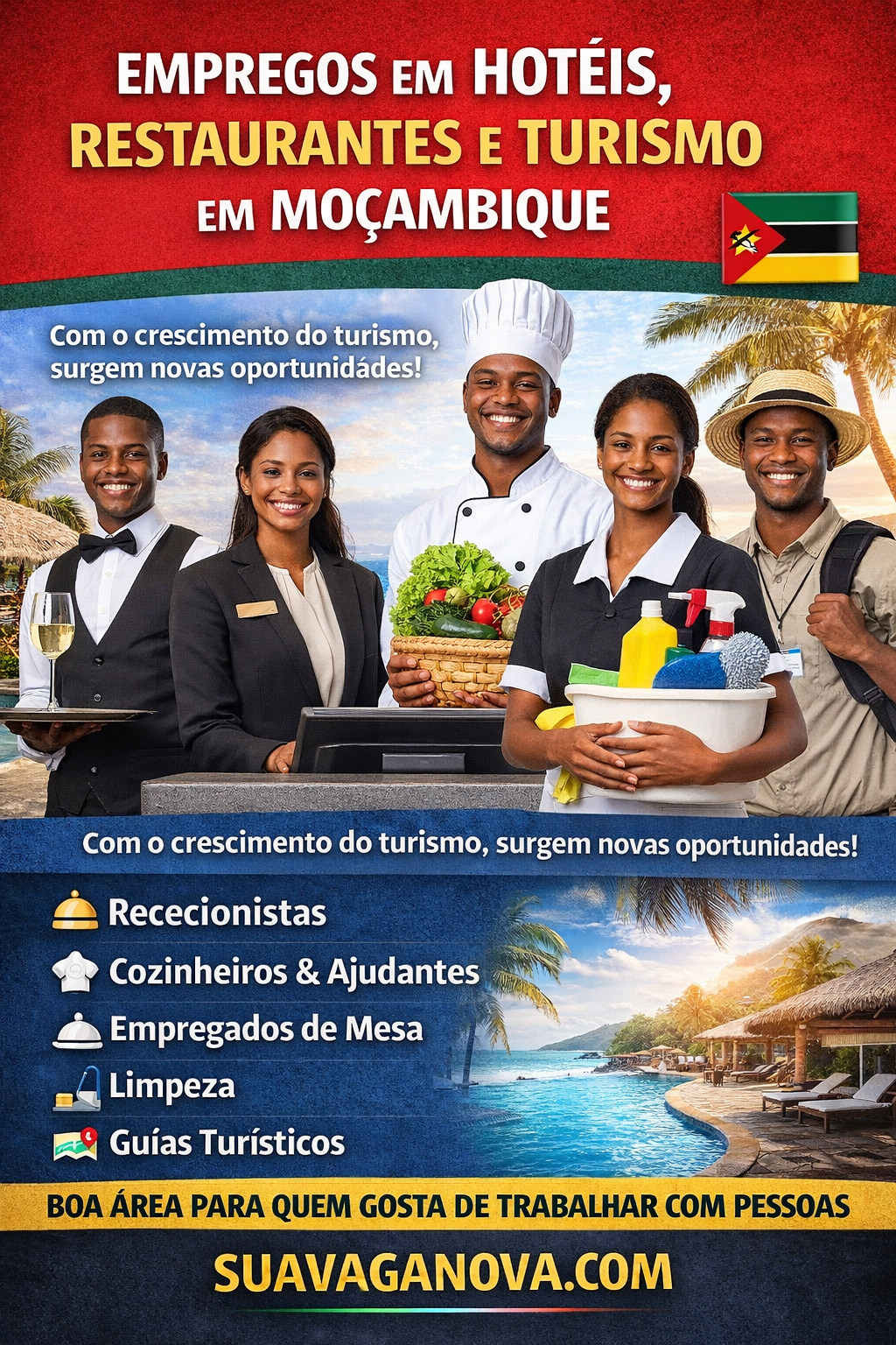 O setor de hotéis, restaurantes e turismo está em crescimento em Moçambique, impulsionado pelo aumento do turismo nacional e internacional. Cidades como Maputo, Inhambane, Vilankulo, Beira e Pemba concentram muitas oportunidades de emprego, sobretudo para quem gosta de trabalhar com pessoas.