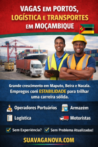 Vagas em Portos, Logística e Transportes em Moçambique SUAVAGAS Vagas em Portos, Logística e Transportes em Moçambique suavaga January 23, 2026 O setor de portos, logística e transportes está em forte crescimento em Moçambique, impulsionado pelo comércio internacional...Read More
